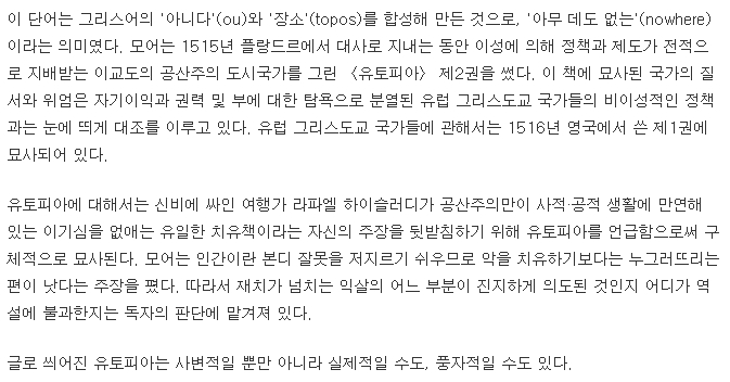 결국, 유토피아는 인간이 갈망하는 완벽한 사회에 대한 상징이자 꿈으로, 우리가 나아가야 할 방향을 제시하면서도 그 꿈의 실현이 불가능하다는 점에서 반어적인 매력을 지닌 개념입니다. 유토피아는 인간 사회의 영원한 이상향으로 남아 있으며, 현실에서는 존재하지 않더라도 인간이 더 나은 세상을 만들기 위한 도전과 희망의 원천으로 기능하고 있습니다.
