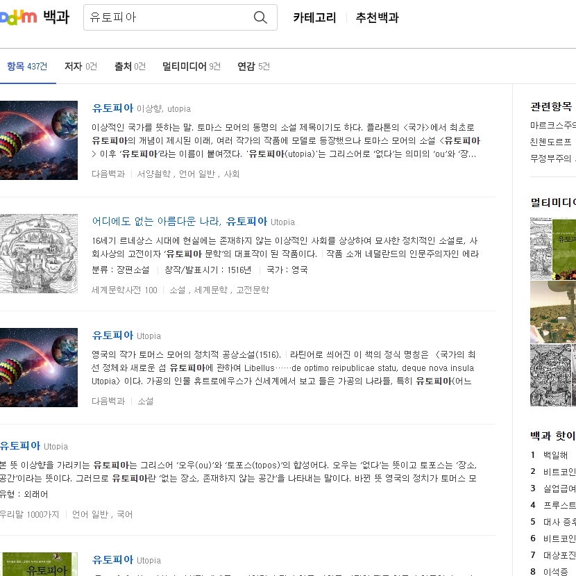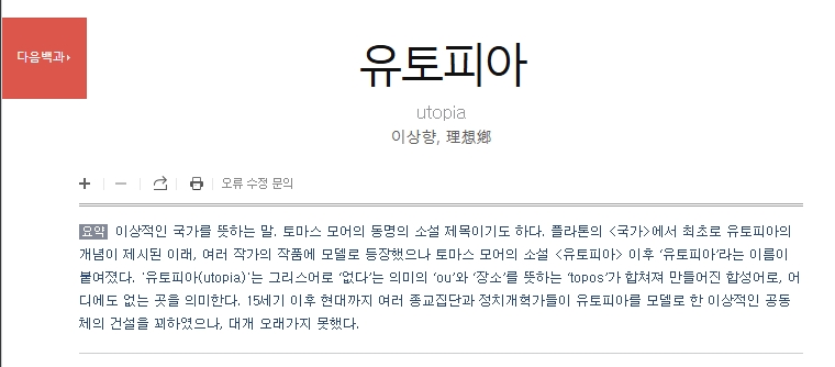 1. 다음백과 홈페이지로 들어갑니다. 다음백과는 다양한 주제와 단어에 대한 설명을 제공하는 포괄적인 온라인 백과사전입니다. 여기서 유토피아의 의미를 검색하여 단어 자체의 뜻, 유래, 그리고 관련 소설과 사상 등 다채로운 정보를 확인할 수 있습니다.