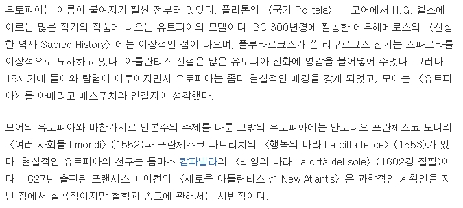 3. 플라톤의 『국가』는 유토피아의 개념을 형성하는 초기 작품 중 하나로, 이상적인 국가와 사회 제도의 모습을 그리고 있습니다. 모어의 『유토피아』는 그리스도교적 가치와 함께 철학적, 사회적 비판의 요소를 담고 있으며, 비현실적이지만 매력적인 이상 국가를 제시합니다. 이와 같은 유토피아적 사회 모델은 인간의 이상을 담은 상징으로, 많은 철학자와 문학가들에게 영감을 주었습니다.