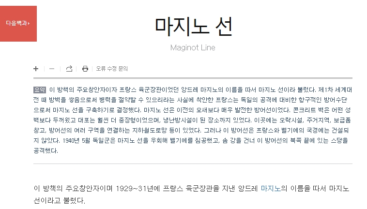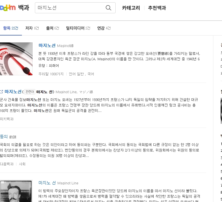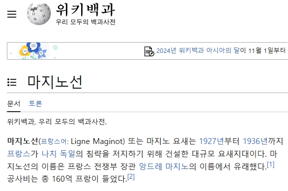 2. 검색창에 마지노선을 입력하여 검색하면 해당 용어의 사전적 의미뿐 아니라 유래와 역사적 배경 등 다양한 설명이 나타납니다. 마지노선은 제1차 세계대전 이후 프랑스가 독일의 침략을 방어하기 위해 구축한 방어선으로, 국경 지대에 걸쳐 강력한 요새를 세운 방어 체계입니다.