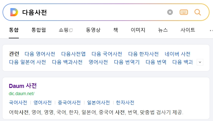 1. 다음사전으로 들어갑니다. 이곳은 한국어, 한자, 영어 등 다양한 언어와 관련된 정보와 뜻을 제공하는 포털 사이트로, 단어의 정의와 용례를 비롯한 여러 자료를 확인할 수 있습니다. 사전에서는 상세한 풀이와 다양한 예시를 통해 단어와 한자의 의미를 보다 깊이 이해할 수 있도록 구성되어 있습니다.