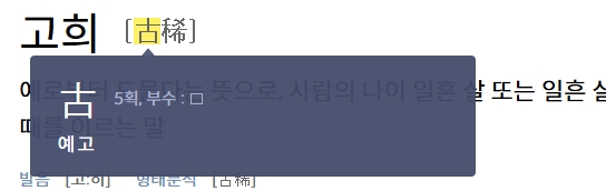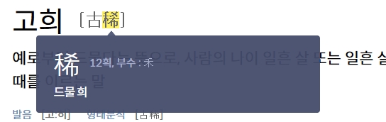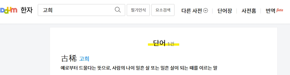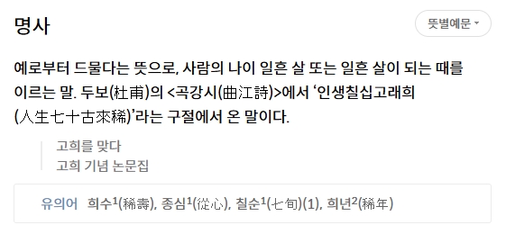 2. 고희를 검색하여 관련 정보를 살펴봅니다. 고희(古稀)는 예로부터 드물다는 뜻으로, 사람이 나이 일흔 살 또는 일흔 살이 되는 때를 의미하는 말입니다. 일반적으로 오래 산 사람에게 축하를 표현할 때 쓰이는 단어로, 한국 문화에서 중요한 인생의 이정표 중 하나로 여겨집니다.