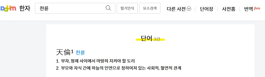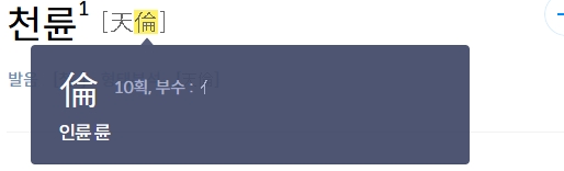 3. 천륜의 한자를 확인할 수 있습니다. 첫 글자인 천(天)은 하늘을 의미하며 네 획으로 이루어져 있습니다. 하늘은 자연 질서와 절대적인 가치를 상징하므로, 천륜에서는 하늘이 부여한 윤리적 질서로서의 의미를 나타냅니다.
