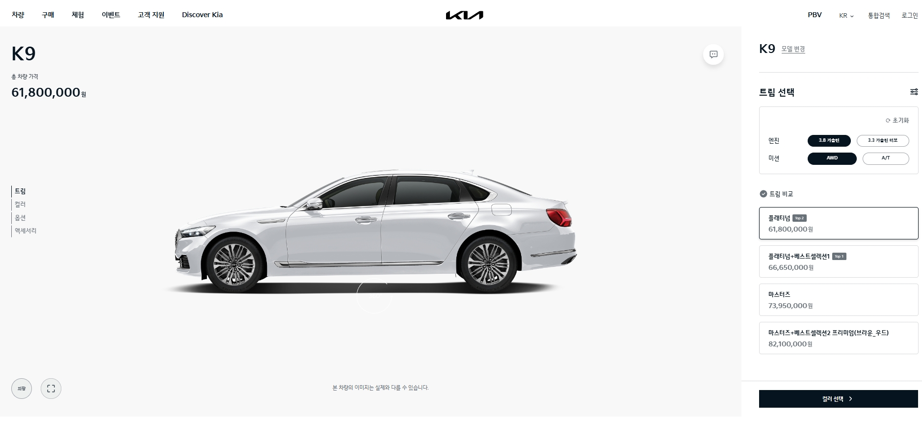 7. K9의 모의 견적 페이지에서는 고객이 다양한 트림과 옵션을 선택할 수 있습니다. 3.8 가솔린과 3.3 가솔린 터보 엔진 중 선택 가능하며, AWD와 A/T 변속기를 지원합니다. 플래티넘 트림은 61,800,000원부터 시작하며, 선택한 옵션에 따라 가격이 달라질 수 있습니다.