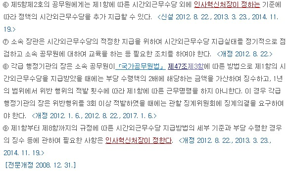 공무원 초과근무수당 계산법은 1일에 4시간, 1개월에 57시간을 초과할 수 없는데요. 하지만 공제되는 시간이 있기에 1일에 4시간을 일한다고 해서 4시간의 금액을 주는 것은 또 아닙니다. 공제에 관한 규정은 바로 아래에 있습니다.