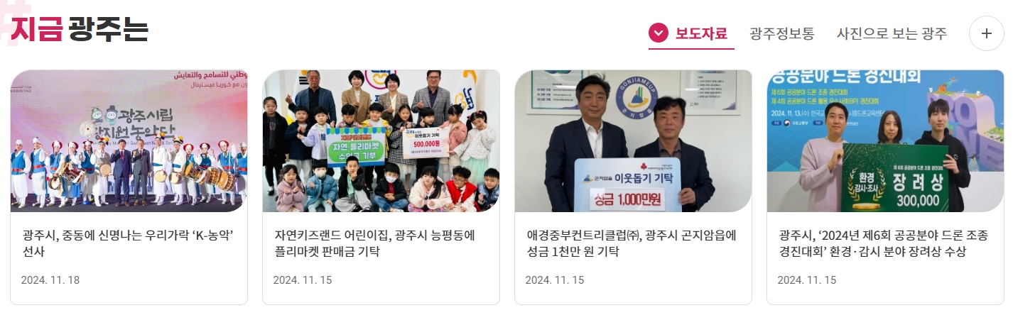 9. 지금 광주는 섹션에서 최신 지역 소식을 확인합니다. 보도자료, 광주정보통, 사진으로 보는 광주 등의 코너를 통해 광주에서 진행되는 행사와 소식을 이미지와 함께 제공합니다. 이를 통해 광주의 다양한 활동과 행사를 생생하게 알 수 있습니다.