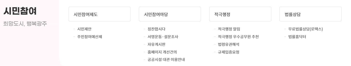 5. 시민참여 메뉴를 통해 시민들의 목소리를 반영합니다. 시민참여 메뉴는 시민참여제도, 시민참여마당, 적극행정, 법률상담 등으로 구성되어 있으며, 시민들의 의견 제안을 받을 수 있는 통로를 제공합니다. 칭찬합시다 코너와 자유 게시판 등을 통해 시민들이 시정에 대해 의견을 제시하거나 문제를 논의할 수 있습니다.