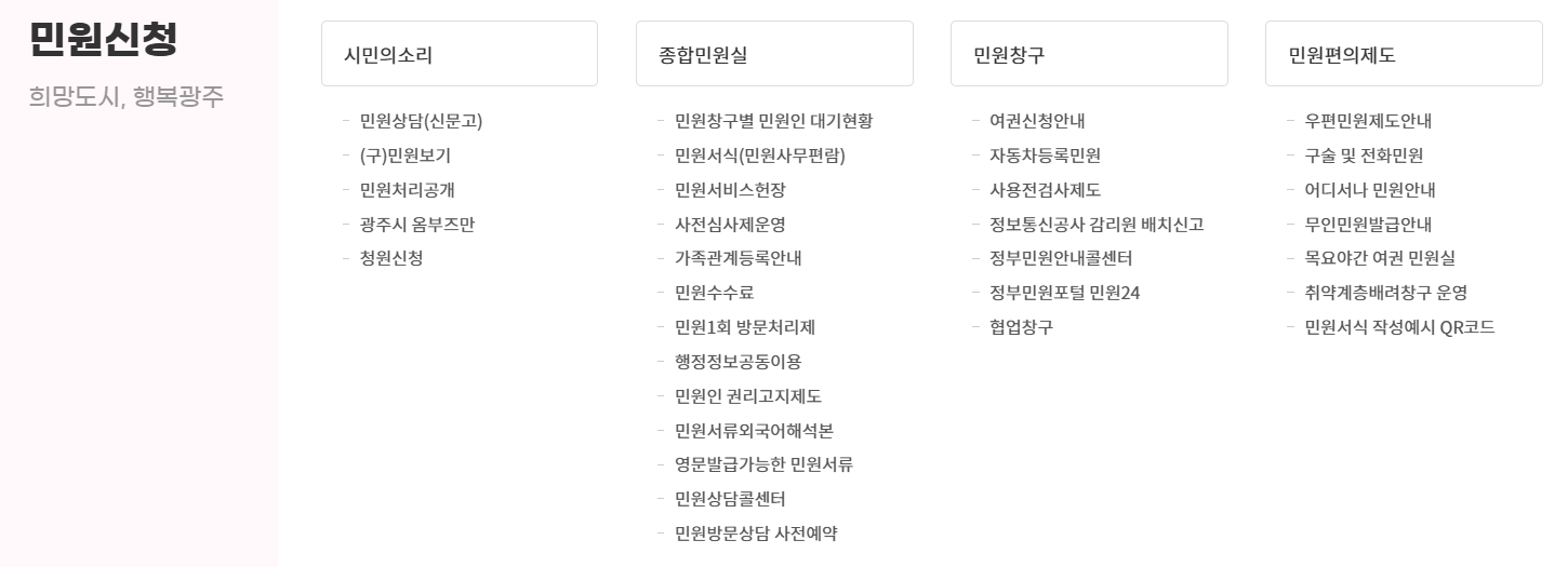 4. 민원신청 메뉴를 활용하여 다양한 민원 서비스를 이용합니다. 민원신청 메뉴에서는 민원 상담, 민원 처리 공개, 종합 민원실, 민원 창구 등을 통해 시민들의 편의를 제공합니다. 민원 서식 다운로드, 민원 처리 진행 현황 확인, 자동차 등록 민원 등 다양한 행정 서비스를 간편하게 이용할 수 있는 플랫폼입니다.