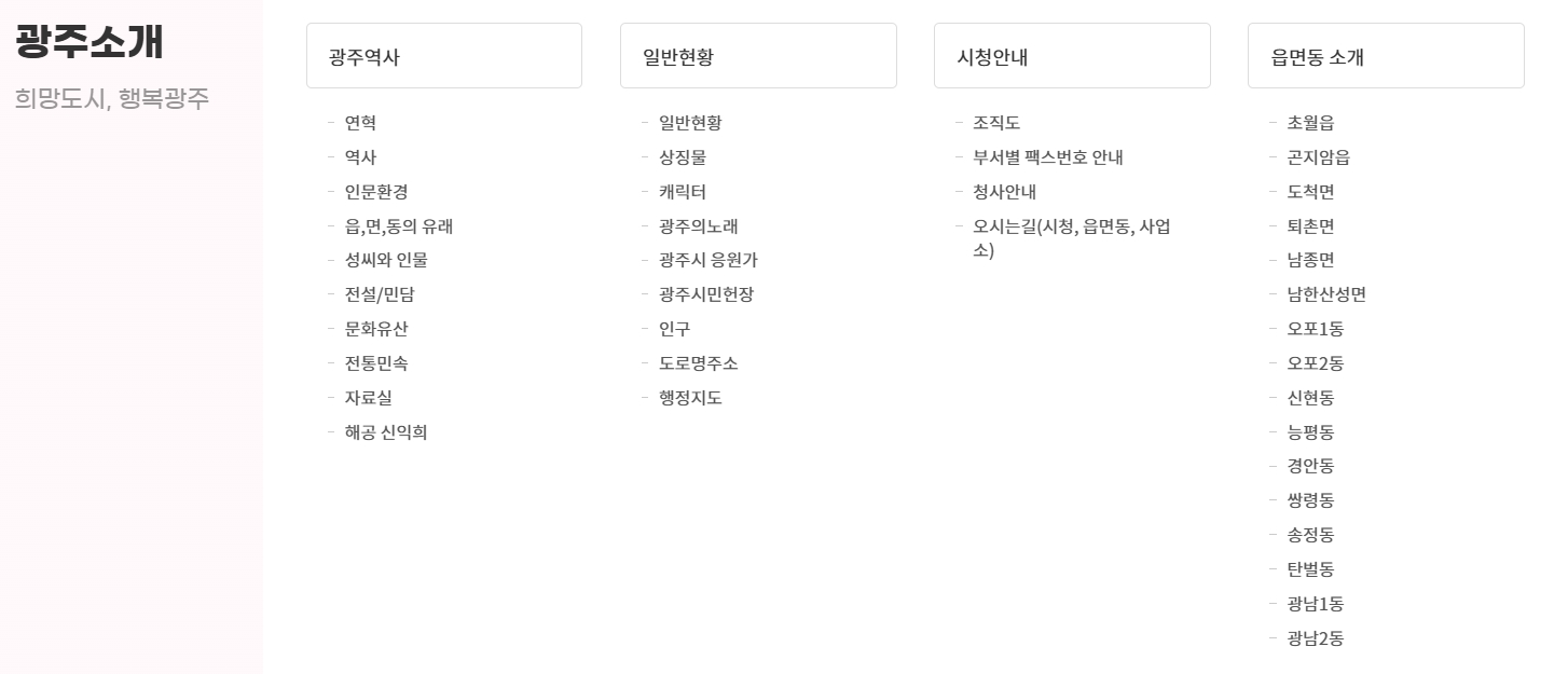 7. 광주소개 메뉴를 통해 광주의 역사와 문화를 알아봅니다. 광주소개 메뉴에서는 광주시의 연혁, 문화유산, 전통 민속 등 광주의 역사적, 문화적 특성을 알 수 있습니다. 더불어 행정지도와 읍면동 소개를 통해 지역별 행정 서비스와 특징을 쉽게 파악할 수 있습니다.