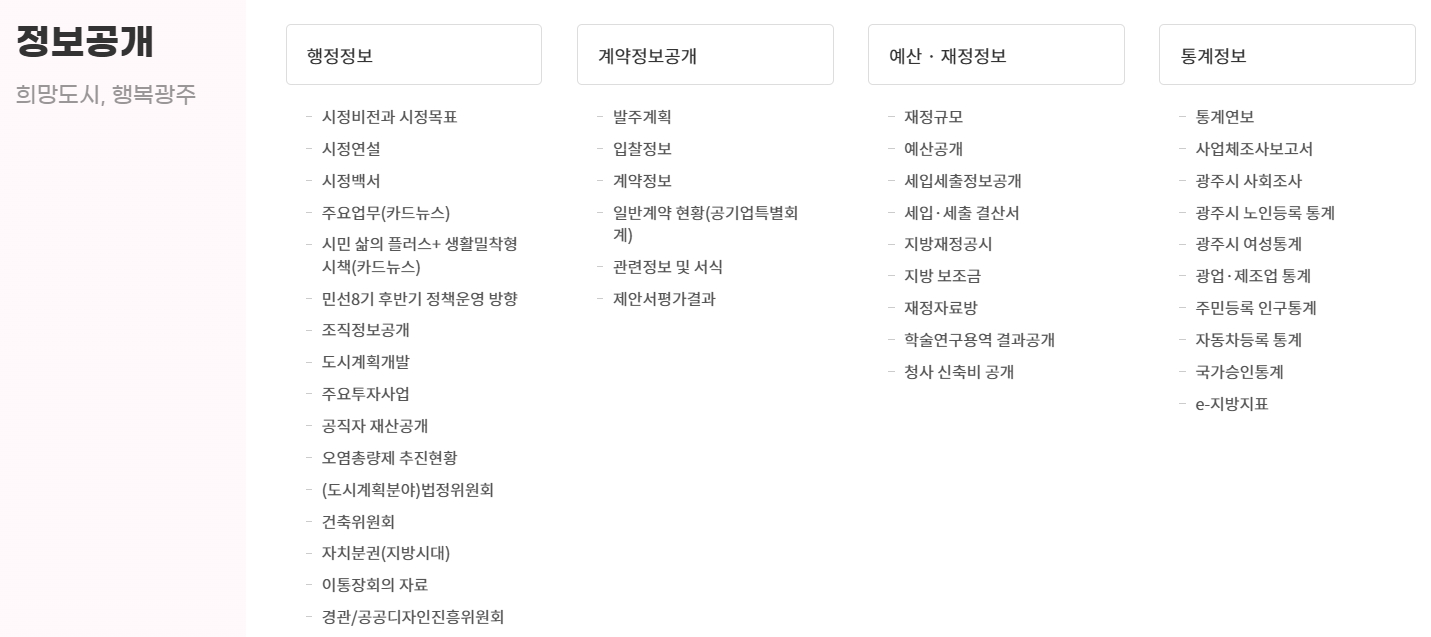 3. 정보공개 메뉴에서 행정 및 재정 관련 자료를 확인합니다. 정보공개 메뉴는 행정정보, 계약정보공개, 예산·재정정보, 통계정보로 세분화되어 있습니다. 시민들은 시정 연설, 주요 사업 계획, 공직자 재산 공개 등 행정 투명성을 높이는 자료를 확인할 수 있습니다. 예산 규모와 재정 집행 현황도 상세히 제공되어 경기도 광주의 예산 운용 상태를 알 수 있습니다.