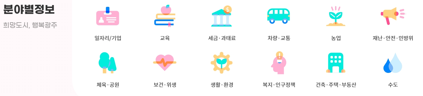 10. 행복광주 TIP 코너에서 시민들에게 유익한 정보를 제공합니다. 행복광주 TIP 코너에서는 생애 주기별 맞춤 정책(임신, 출산, 청년, 노후 지원 등)과 지역 주민들을 위한 편리한 서비스(광주사랑카드, 배달특급 등)를 안내합니다. 시민들은 생활 편의를 위한 유용한 정보를 한눈에 확인할 수 있습니다.
