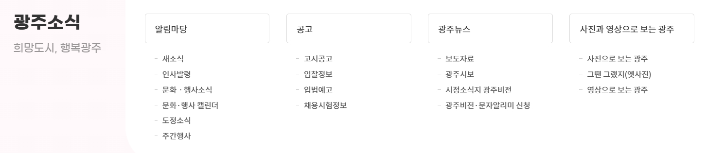 2. 광주소식 메뉴를 클릭하여 새로운 정보를 확인합니다. 광주소식 메뉴는 알림마당, 공고, 광주뉴스, 사진과 영상으로 보는 광주 등으로 구성되어 있습니다. 새소식, 문화 행사 소식, 주간 행사 등을 통해 시의 최신 소식을 빠르게 파악할 수 있으며, 시정 운영과 관련된 입찰 정보나 채용 시험 공고도 확인 가능합니다.
