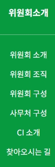 2. 위원회 소개 메뉴를 확인합니다. 위원회 소개 섹션에서는 위원회의 설립 배경과 주요 역할을 안내하며, 위원회 조직과 구성원 정보, 사무처 구성 내용을 포함하고 있습니다. CI 소개와 방문을 위한 경로 안내도 함께 제공되어 방문자의 편의를 돕습니다.
