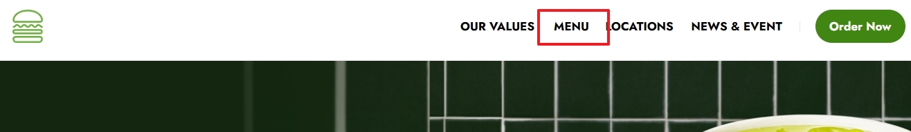 2. 상단 메뉴에서 menu를 클릭합니다. 여기에서 다양한 카테고리의 메뉴를 확인할 수 있습니다. 버거, 치킨, 사이드 메뉴, 디저트, 음료 등이 포함되어 있으며, 각 카테고리마다 풍부한 선택지를 제공합니다.