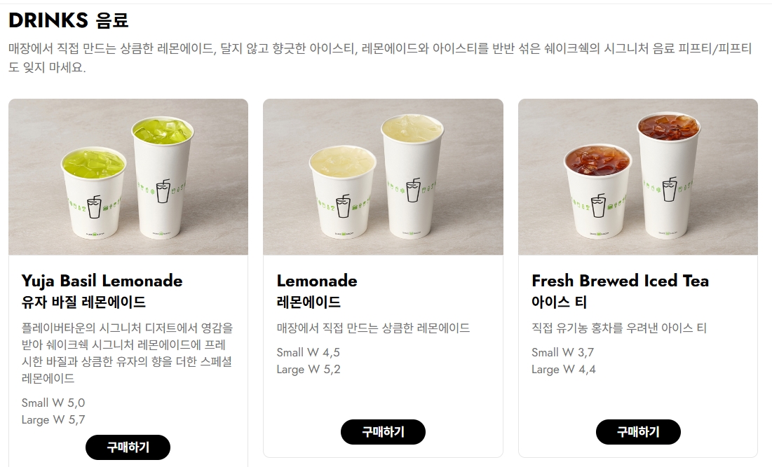 16. 유자 바질 레몬에이드는 쉐이크쉑만의 스페셜 레몬에이드로, 프레시한 바질과 상큼한 유자가 만나 신선한 풍미를 자랑합니다. 바질의 은은한 허브향과 유자의 새콤달콤한 맛이 어우러져 더운 날씨에 상쾌하게 즐길 수 있는 음료로, 가격은 Small 5,000원, Large 5,700원입니다.