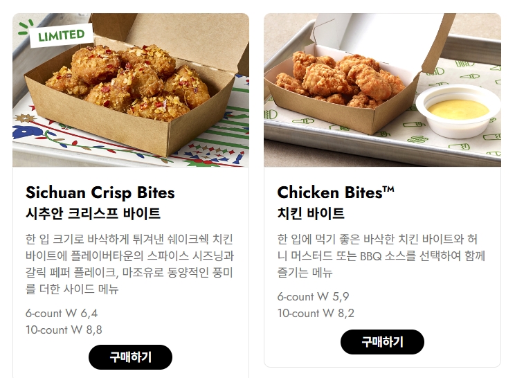 11. 핫 치킨은 두툼하고 바삭한 치킨 패티에 스파이시 슬로와 핫 스파이시 시즈닝을 더해 매콤함과 달콤함이 어우러진 특별한 치킨 버거입니다. 양상추와 감자 번이 더해져 부드러우면서도 강렬한 풍미를 자랑하며, 가격은 9,500원입니다. 10. 시추안 크리스프 치킨은 플레이버타운 스타일의 칠리 크리스프 오일과 얼얼한 마조유를 입힌 바삭한 치킨 패티에 쪽파 마요 소스, 양상추, 피클링된 청오이가 더해진 치킨 버거입니다. 매콤하면서도 바삭한 식감과 조화로운 맛이 특징인 메뉴로, 가격은 10,500원입니다.