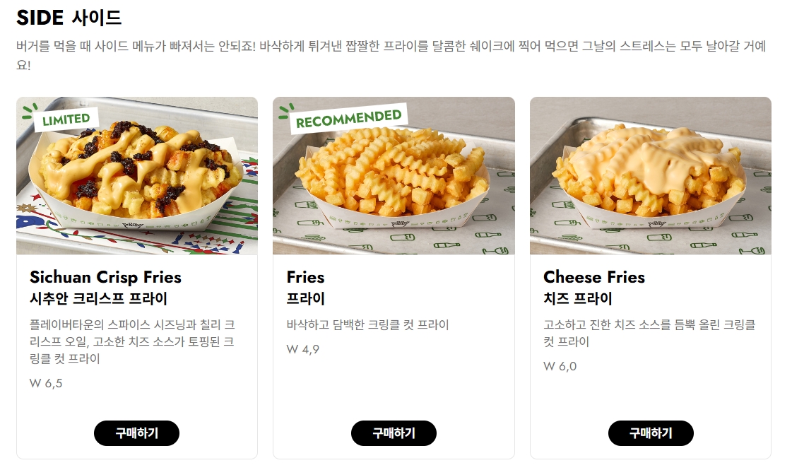 쉑버거를 먹을 때 꼭 곁들이는 게 바로 감자튀김인데요, 저는 항상 치즈 프라이를 시켜요. 치즈 소스를 따로 받아서 감자튀김에 찍어 먹으면 정말 중독적인 맛이 나요. 게다가 쉐이크를 하나 추가하면 완벽한 한 끼가 되죠. 쉐이크의 달콤함이 버거와 감자튀김의 짭짤함과 정말 잘 어울려요. 제가 가장 좋아하는 조합은 쉑버거 + 치즈 프라이 + 초콜릿 쉐이크인데, 마지막까지 맛의 조화를 즐길 수 있답니다.