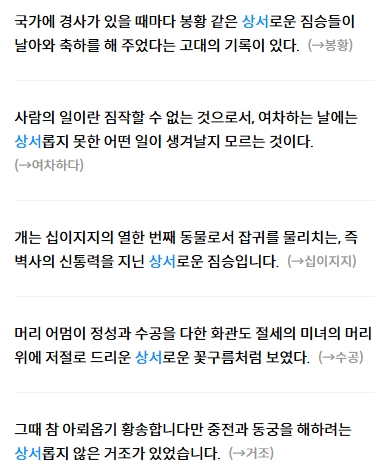 5. 상서롭다와 관련된 다양한 예문을 확인합니다. 예문으로는 국가에 경사가 있을 때마다 봉황 같은 상서로운 짐승들이 나타났다.와 같은 표현이 있습니다. 이처럼 상서롭다는 역사적, 문화적 맥락에서 복된 징조로 해석되며, 긍정적인 상황을 표현할 때 자주 사용됩니다.