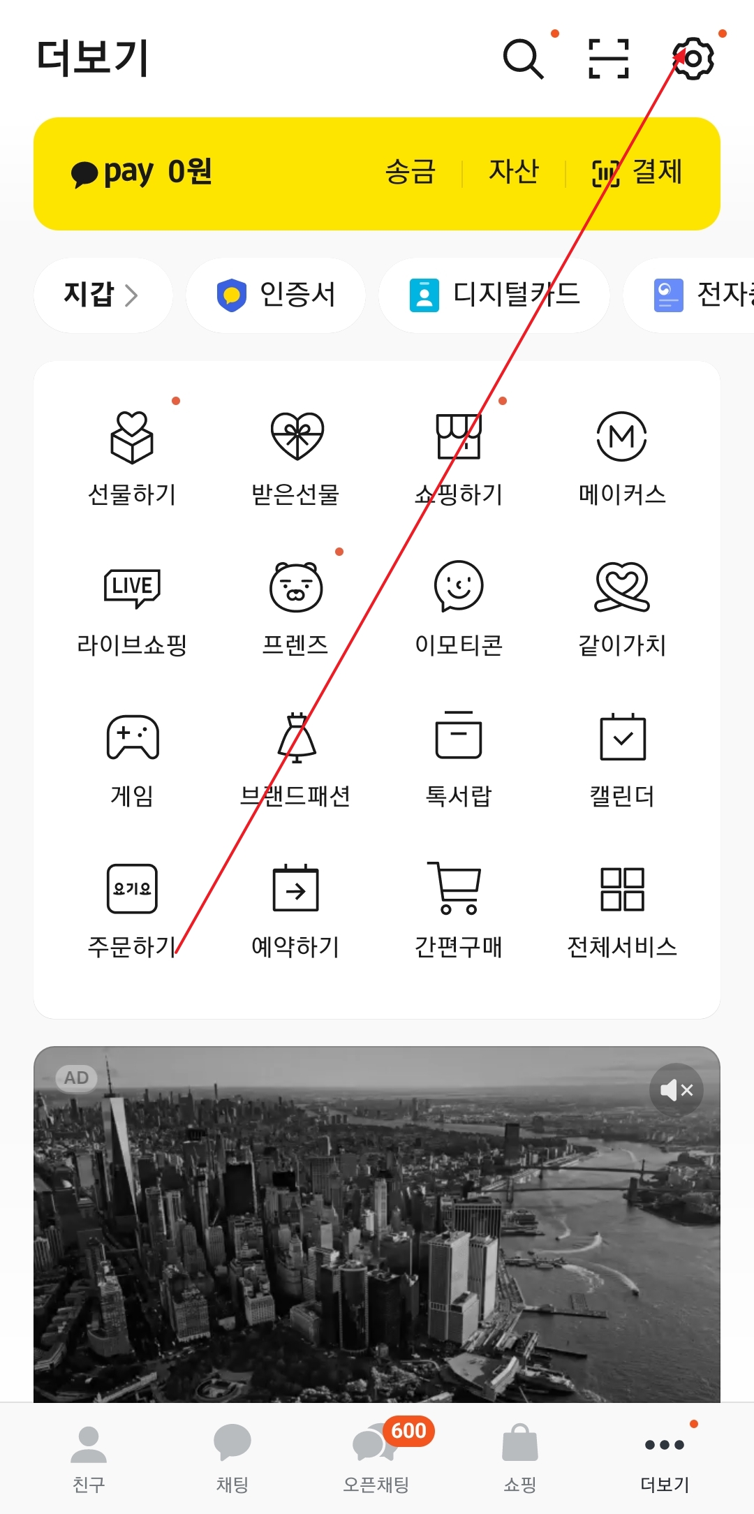 2. 더보기 메뉴 화면으로 이동하면 화면 오른쪽 상단에 톱니바퀴 모양의 설정 아이콘이 보입니다. 이 아이콘을 선택하면 카카오톡의 설정 메뉴로 들어가 다양한 사용자 정의 옵션을 확인할 수 있습니다.