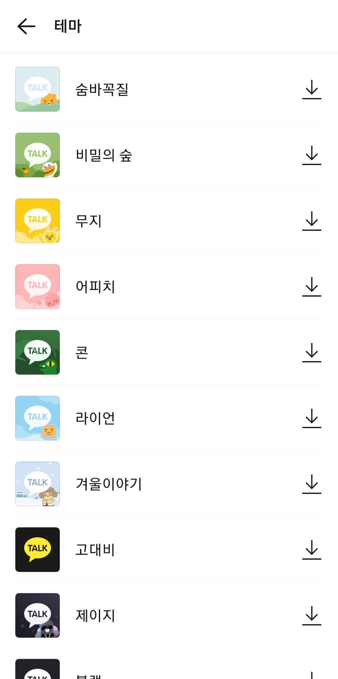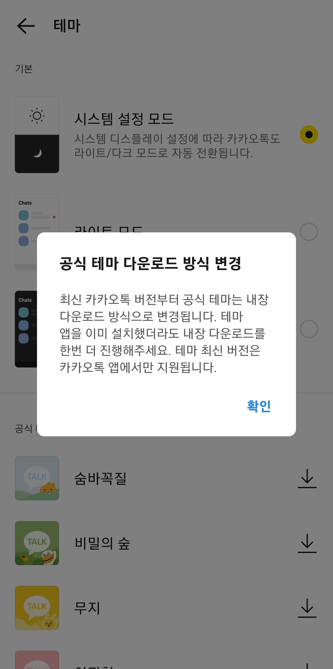 5. 시스템 기본 테마 외에도 숨바꼭질, 비밀의 숲, 무지와 같은 다양한 공식 테마들이 목록에 표시됩니다. 원하는 테마를 선택한 후, 다운로드 버튼을 누르면 테마가 적용되고, 카카오톡의 화면 디자인이 즉시 변경됩니다.