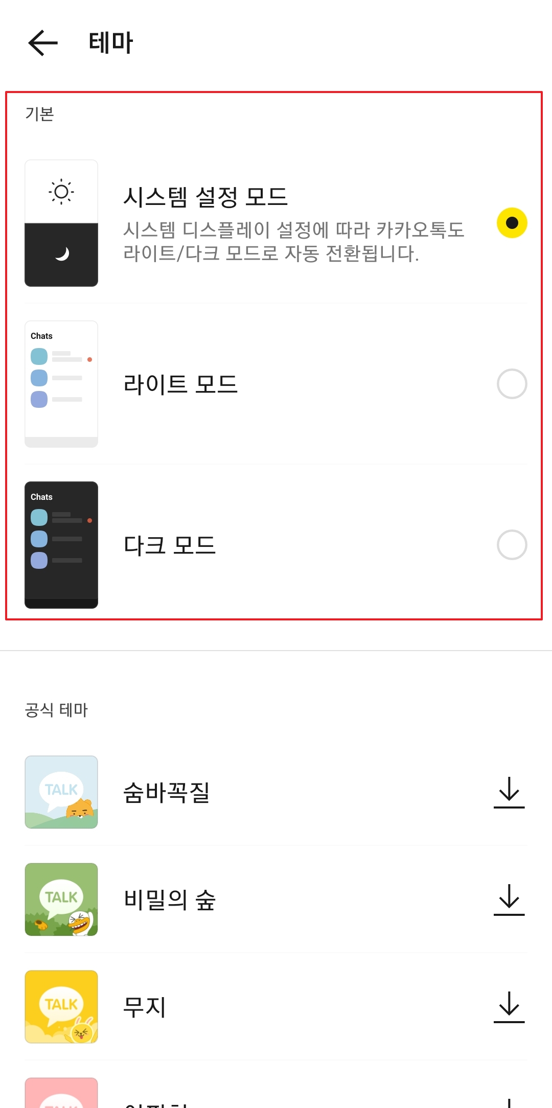 4. 테마 설정 화면에서는 기본적으로 제공되는 여러 테마 중에서 선택할 수 있습니다. 시스템 설정 모드를 선택하면 기기의 디스플레이 설정에 따라 카카오톡이 자동으로 라이트 모드와 다크 모드를 전환합니다. 또는 라이트 모드와 다크 모드를 직접 선택해 고정할 수도 있습니다.