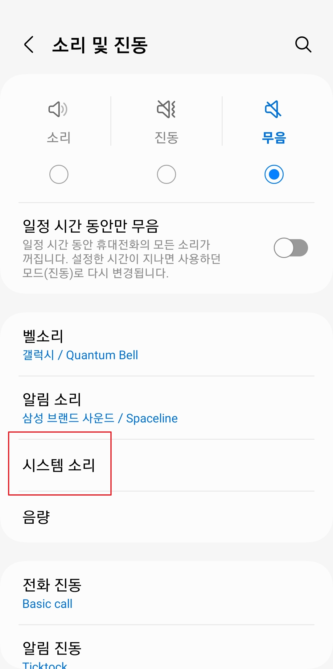 3. 화면이 이동되면 시스템 소리 항목을 선택합니다. 시스템 소리는 기기의 다양한 인터페이스에서 발생하는 소리와 관련된 옵션을 관리할 수 있는 메뉴입니다.