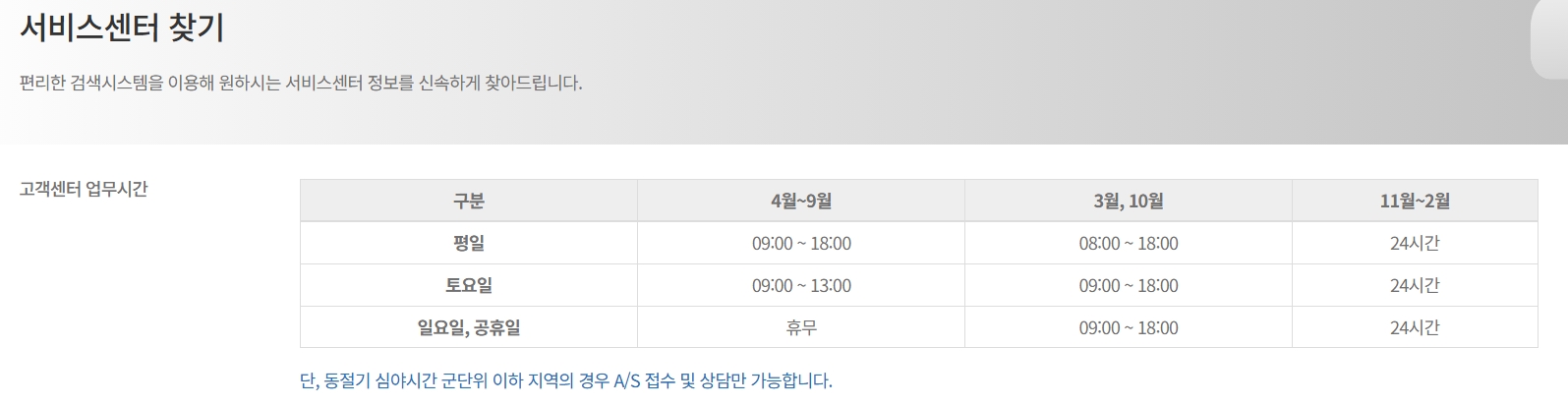 서비스센터의 운영 시간 역시 계절에 따라 다릅니다. 하절기(5월~8월)에는 평일과 토요일 오전 9시부터 오후 6시까지 운영하며, 일요일과 공휴일은 문을 열지 않습니다. 환절기(3월, 4월, 9월, 10월)에도 동일하게 평일과 휴일 모두 오전 8시부터 오후 6시까지 운영됩니다. 동절기에는 서비스센터의 운영 시간이 연장되어, 오전 8시부터 자정까지 서비스를 제공합니다. 이 시기에는 고객의 불편을 최소화하기 위해 심야 시간까지 대응이 가능한 점이 특징입니다.