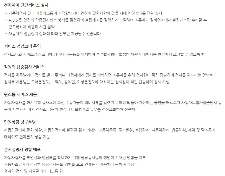 한국교통안전공단에서는 전자제어 진단서비스, 서비스 점검코너, 직원의 탑승검사, 원스톱, 민원상담 창구, 검사실명제 명함 배포 등의 서비스를 제공합니다.