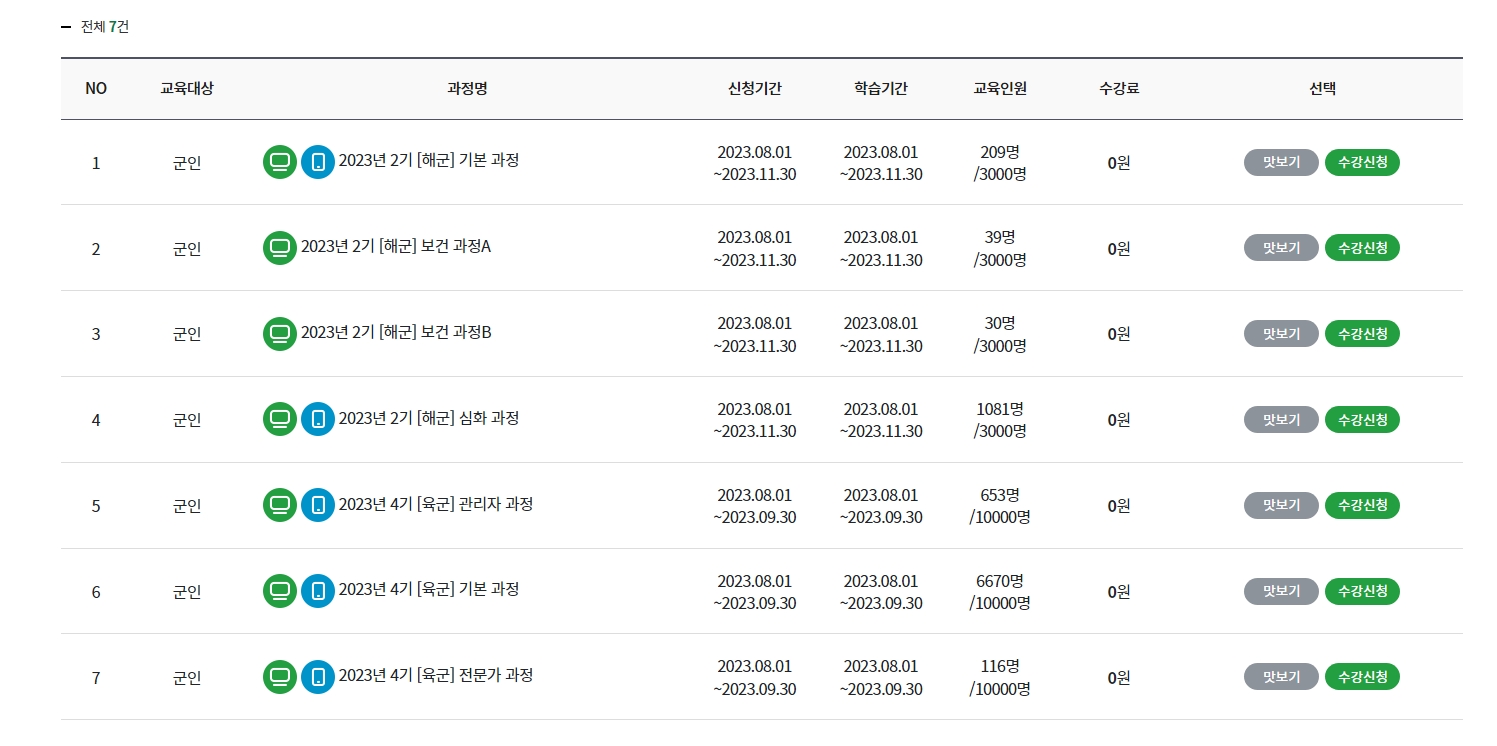 7. 예를 들어, 군인을 위한 교육과정을 선택하면 육군, 해군 등으로 나누어진 세부 항목을 볼 수 있습니다. 각 항목은 기본, 전문가, 심화, 보건 과정으로 구성되어 있어 사용자가 자신의 수준에 맞는 과정을 선택할 수 있습니다.