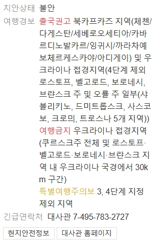 5. 러시아의 치안 상태는 지역에 따라 크게 다릅니다. 모스크바와 상트페테르부르크와 같은 대도시는 비교적 안전하지만, 북카프카스 지역(체첸, 다게스탄, 세베로오세티야 등)은 출국 권고 지역으로 분류되어 있으며, 우크라이나 접경 지역은 여행 경보가 발령된 상태입니다. 이러한 지역은 정치적 갈등과 치안 문제로 인해 방문 시 주의가 필요합니다. 여행 전 반드시 외교부와 대사관의 안전 정보를 확인하고, 긴급 상황 발생 시 대사관(전화: +7-495-783-2727)에 연락할 수 있도록 준비해야 합니다.