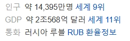 2. 인구는 약 1억 4,395만 명으로 세계에서 9위를 차지합니다. 러시아의 인구는 대부분 모스크바와 상트페테르부르크와 같은 서부 지역에 밀집되어 있으며, 동부 지역은 상대적으로 인구 밀도가 낮습니다. 경제적으로는 세계 11위로, GDP는 약 2조 5,568억 달러에 이릅니다. 러시아는 풍부한 천연자원, 특히 석유와 천연가스를 기반으로 한 경제 구조를 가지고 있으며, 에너지 자원 수출이 국가 경제에 중요한 역할을 하고 있습니다. 공식 통화는 러시아 루블(RUB)로, 세계 경제에서 일정한 위치를 차지하고 있습니다.