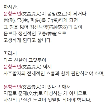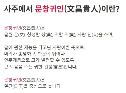 2. 문창귀인을 검색하여 관련 정보를 확인합니다. 문창귀인(文昌貴人)은 글월 문(文), 창성할 창(昌), 귀할 귀(貴), 사람 인(人)으로 이루어진 명칭으로, 글과 학문에 뛰어난 재능을 가진 사람에게 부여되는 길성(吉星)으로 간주됩니다. 이는 학문적 발전과 창의력을 강화하는 요소로, 인문학적 성공을 예고하는 길한 별로 해석됩니다.