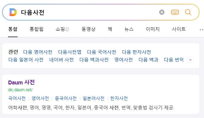 1. 다음사전에 접속합니다. 다음사전은 국어, 영어, 한자, 일본어, 중국어 등 다양한 언어 사전과 번역 서비스, 맞춤법 검사기를 제공하는 플랫폼입니다. 사용자는 여기에서 특정 단어의 의미를 확인하거나 관련 정보를 탐색할 수 있습니다.