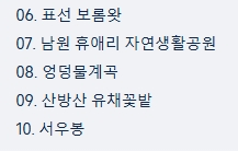 4. 제주 유채꽃을 감상할 수 있는 명소 추천 목록을 확인합니다. 성산 섭지코지, 성산 광치기해변, 성산 짱구네 유채꽃밭 등 제주도를 대표하는 유채꽃 명소들이 순위별로 정리되어 있습니다. 각 명소는 유채꽃의 아름다움을 감상할 수 있는 최적의 장소로 손꼽히며, 관광객들에게 많은 사랑을 받고 있습니다.