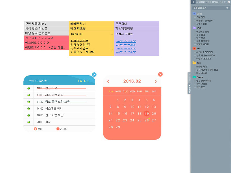 또한, 달력을 통해 메모를 시각적으로 확인할 수 있으며, 다양한 색상과 카테고리로 메모를 분류할 수 있어 직관적인 관리가 가능합니다. 바탕화면에 항상 표시되도록 설정할 수 있어 잊지 않고 확인할 수 있습니다.