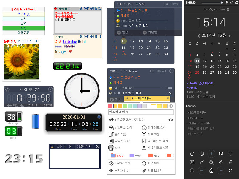 5. 에스메모의 추가적인 장점은 다양한 유틸리티 기능입니다. 시계, 달력, 알람 설정, 예약 종료 등 여러 기능이 포함되어 있어 프로그램 하나로 다양한 작업을 처리할 수 있습니다. 또한, 메모장을 정렬하거나 크기를 맞추는 기능도 제공되어 깔끔한 화면 구성이 가능합니다.