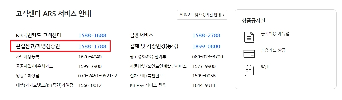 4. 고객센터 ARS 서비스 안내를 보면 분실신고를 위한 전화번호가 표시됩니다. 국내에서는 1588-1788로 24시간 접수가 가능합니다.