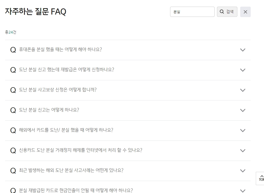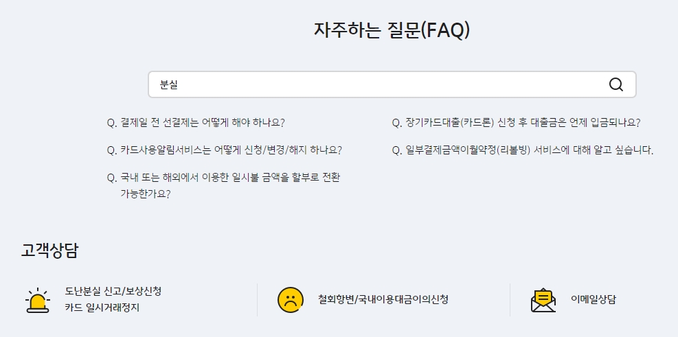 5. 고객센터 페이지의 자주 묻는 질문 섹션에서 분실 키워드를 검색하여 추가 정보를 확인할 수 있습니다. 예를 들어, 분실 신고 후 재발급 절차에 대한 안내가 포함됩니다.