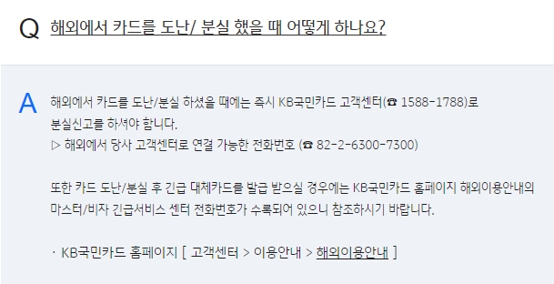 8. 해외에서 분실한 경우에는 82-2-6300-7300으로 전화를 걸어 분실 신고를 접수할 수 있습니다. 이 번호는 해외에서도 바로 연결되며, 한국어 상담이 가능합니다.