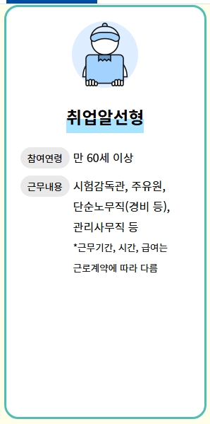 8. 취업알선형은 만 60세 이상의 노인을 대상으로 하며, 시험 감독관, 주유원, 단순노무직 등의 직종에서 활동할 수 있습니다. 근무 기간, 시간, 급여는 기업 근로계약에 따라 다르며, 노인들의 경제적 활동을 돕고 안정된 노후를 지원하기 위한 프로그램입니다.