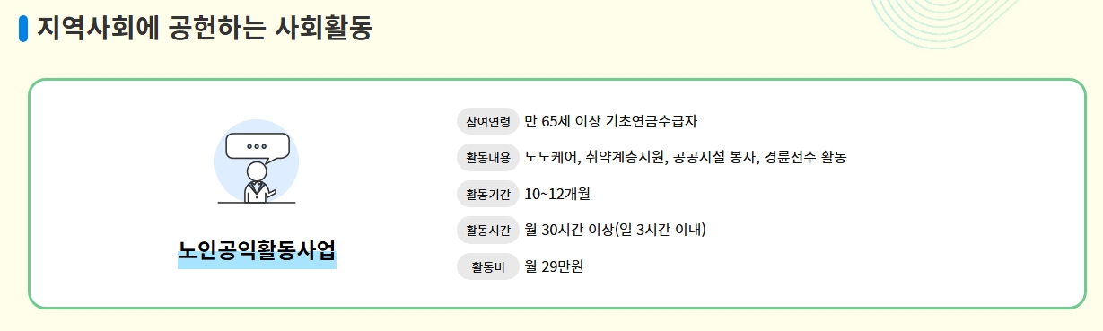 5. 노인공익활동사업은 만 65세 이상 기초연금 수급자를 대상으로 하며, 노노케어, 취약계층 지원, 공공시설 봉사 등 지역사회에 기여할 수 있는 활동을 제공합니다. 월 30시간 이상의 활동이 요구되며, 활동비로 월 29만 원을 지급받을 수 있습니다. 이는 노인들의 사회적 역할과 자존감을 증진시키는 데 기여합니다.