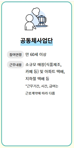 7. 공동체사업단은 만 60세 이상을 대상으로 하며, 소규모 매장 운영, 아파트 택배 등 다양한 업무를 제공합니다. 이 프로그램은 소규모 창업이나 지역 기반 서비스를 통해 경제적 활동을 지원하며, 참여자들에게 안정적인 수입과 경제적 자립 기회를 제공합니다.