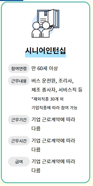 4. 시니어 인턴십은 만 60세 이상을 대상으로 하며, 버스 운전원, 조리사, 제조 종사자 등 다양한 직종에서 참여가 가능합니다. 이 프로그램은 기업 근로계약에 따라 근무 기간, 시간, 급여가 정해지며, 노인들의 사회적 참여를 높이고 경제적 자립을 지원하는 데 초점이 맞춰져 있습니다.