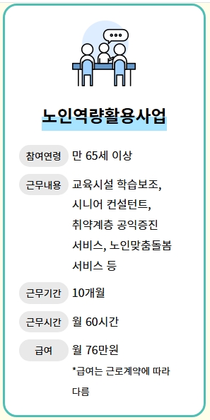 6. 노인역량활용사업은 교육시설 학습 보조, 시니어 컨설턴트 등의 업무를 포함하며, 참여 연령은 만 65세 이상입니다. 근무 기간은 10개월이며, 월 60시간 정도 근무하며 월 76만 원의 급여를 받을 수 있습니다. 노인들의 전문성과 경험을 활용한 프로그램으로 사회적 가치를 창출합니다.