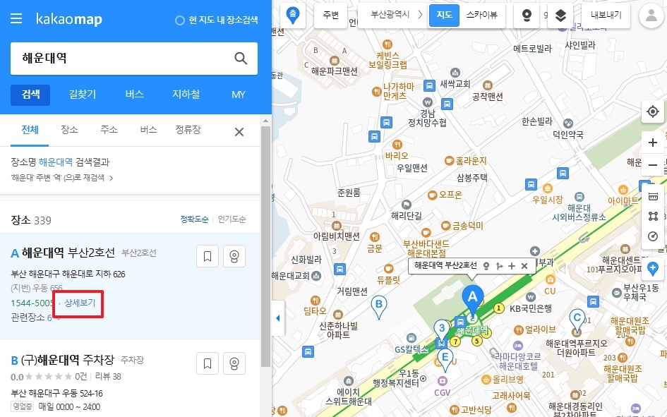 3. 검색 결과에서 해운대역 부산2호선을 선택하고, 제공된 상세보기 버튼을 클릭합니다. 상세보기에서는 역의 위치 정보, 주소, 전화번호 및 역과 관련된 다양한 정보를 확인할 수 있습니다. 특히, 부산 지하철 노선도를 기반으로 한 역의 정확한 위치를 지도에서 쉽게 확인할 수 있습니다.