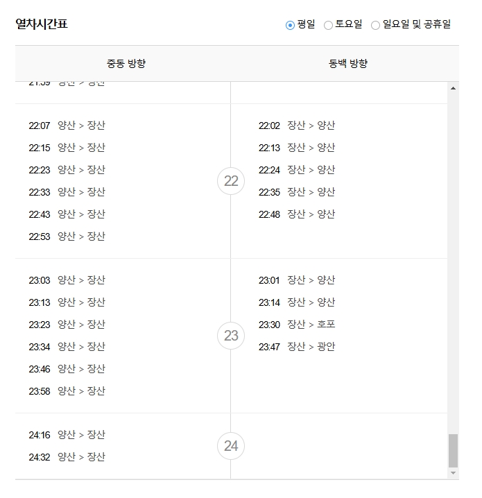 4. 상세 정보에서 지하철 운행 시간표를 확인합니다. 양산 방향과 장산 방향으로 나뉘어 있으며, 각각의 시간표가 구체적으로 제공됩니다. 예를 들어, 동백 방향의 마지막 열차는 23:47에 출발합니다.