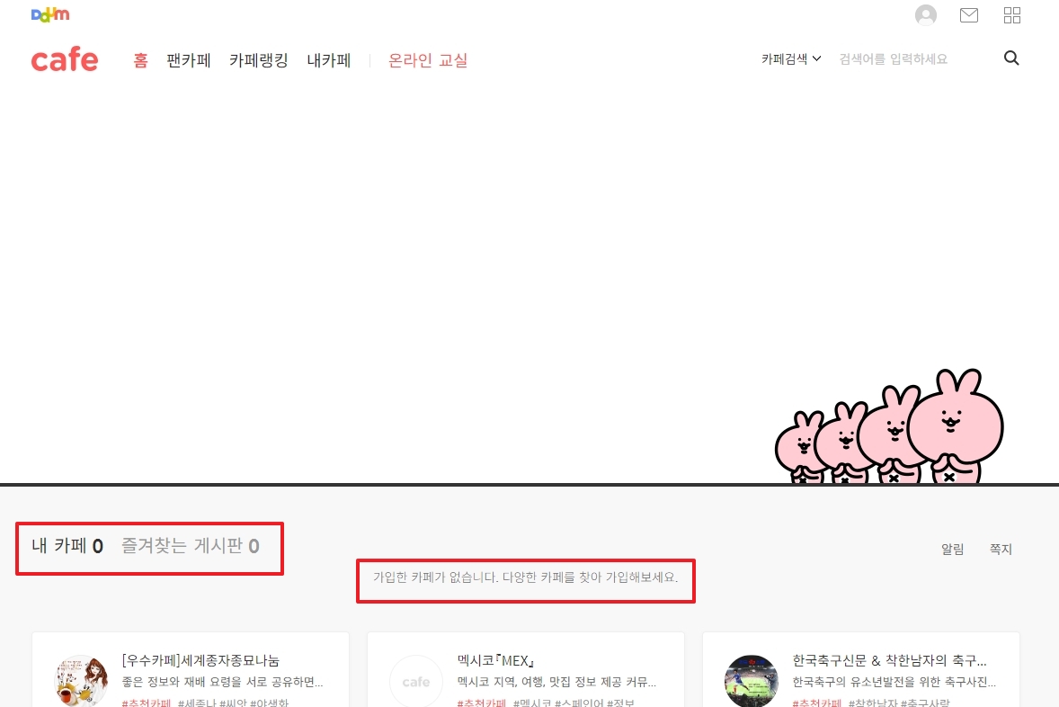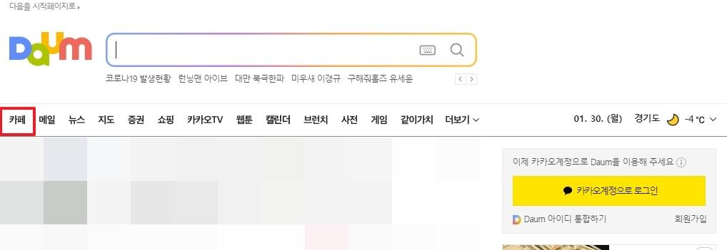 1. 다음 홈페이지에 접속하면 화면 좌측 상단에 있는 메뉴를 살펴보세요. 그중에서 첫 번째 항목으로 보이는 카페를 클릭하면 다음 카페 메인 페이지로 이동할 수 있습니다. 이곳에서는 다양한 카페를 탐색하거나, 직접 카페를 개설할 수도 있습니다. 특히 관심사에 따라 카페를 추천받을 수도 있어 처음 사용하는 분들도 쉽게 접근할 수 있습니다.