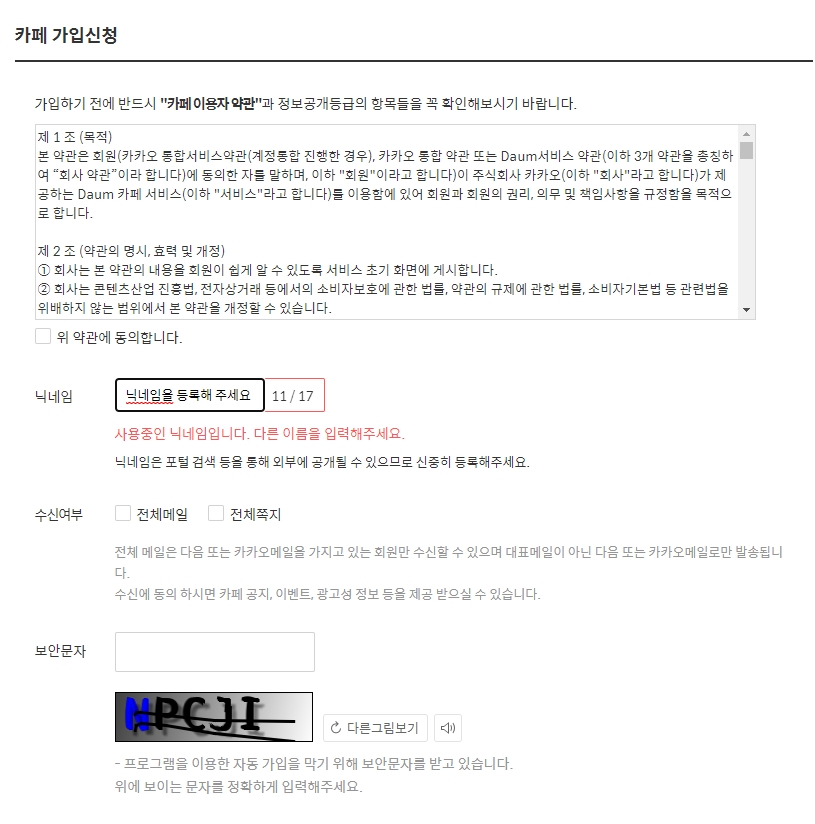6. 카페를 클릭하면 카페 가입하기 버튼이 보입니다. 이 버튼을 누르면 가입 절차가 시작됩니다. 가입 과정에서는 닉네임 설정, 메일 수신 여부, 보안 문자 입력 등이 필요할 수 있습니다. 모든 절차를 완료하면 해당 카페의 멤버로 활동할 수 있습니다. 모바일에서는 우측 상단 메뉴를 통해 가입 버튼을 찾을 수 있습니다.