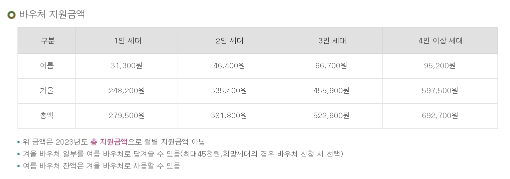 바우처 지원 금액은 1인, 2인, 3인, 4인 이상 세대로 나뉘고 여름과 겨울로 나뉩니다. 1인 세대 기준으로 여름에는 3.13만원, 겨울에는 24.82만원이 지원됩니다. 4인 이상 세대 기준으로 여름에는 9.52만원, 겨울에는 59.7만원이 지원됩니다.
