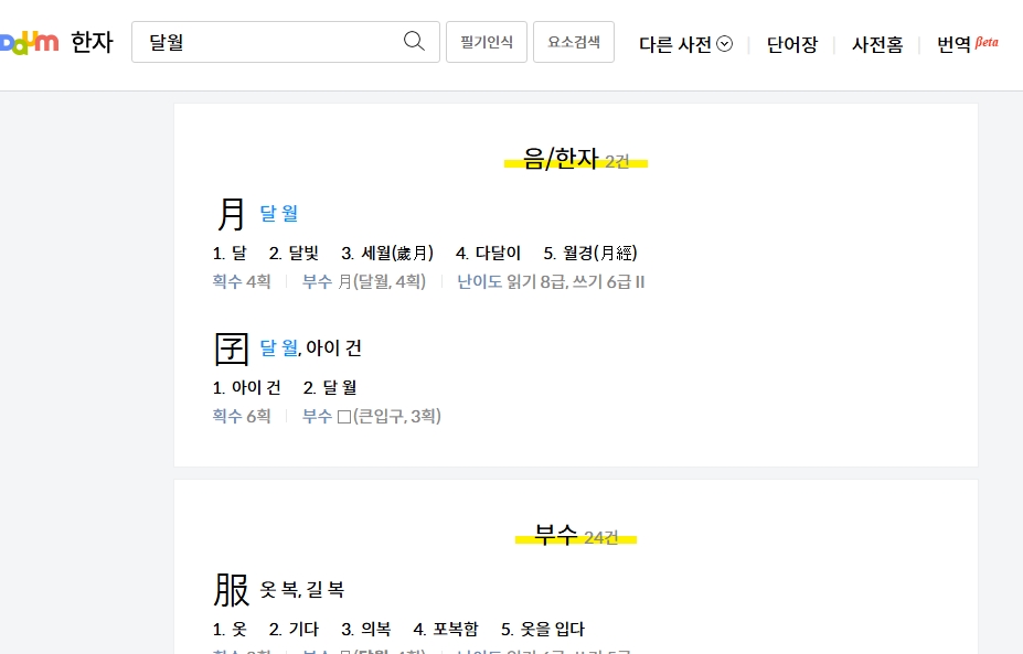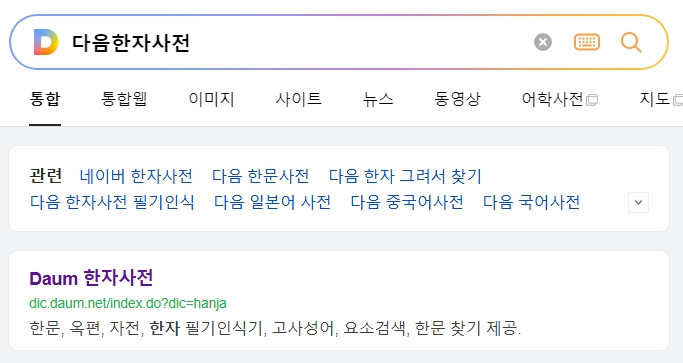 1. 다음한자사전에 접속합니다. 이 사전은 한문 검색, 옥편 및 자전 기능뿐만 아니라 한자 필기인식기, 고사성어 검색, 요소 검색, 한문 해석 등의 다양한 서비스를 제공합니다.